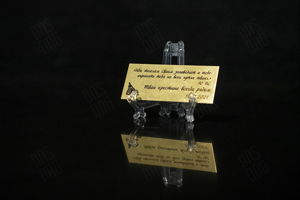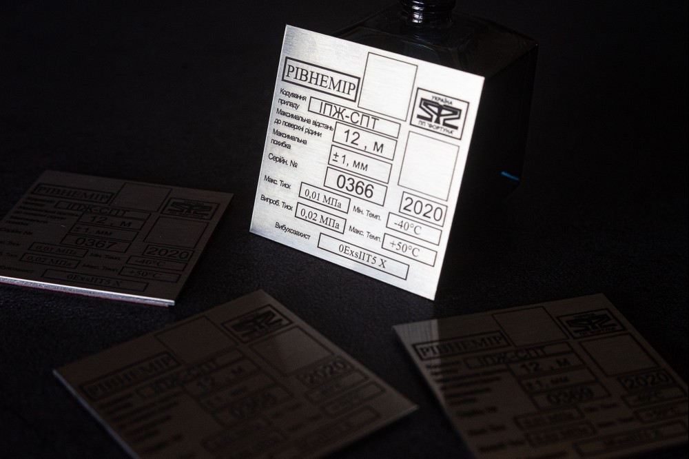- Лазерне гравіювання — створює чіткий напис, що зберігає свій вигляд роками, стійкий до стирання навіть при інтенсивному використанні. Ідеально не лише для декоративних табличок, але і для технічних шильд, адже лазерне гравіювання забезпечує стійкість до агресивних середовищ, масел, розчинників та абразивів, гарантує збереження інформації на весь термін служби обладнання.
